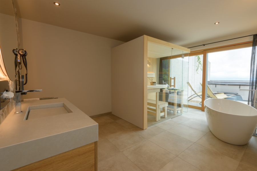 - Ein Wohlfühl-Badezimmer mit freistehender Badewanne und Regendusche
